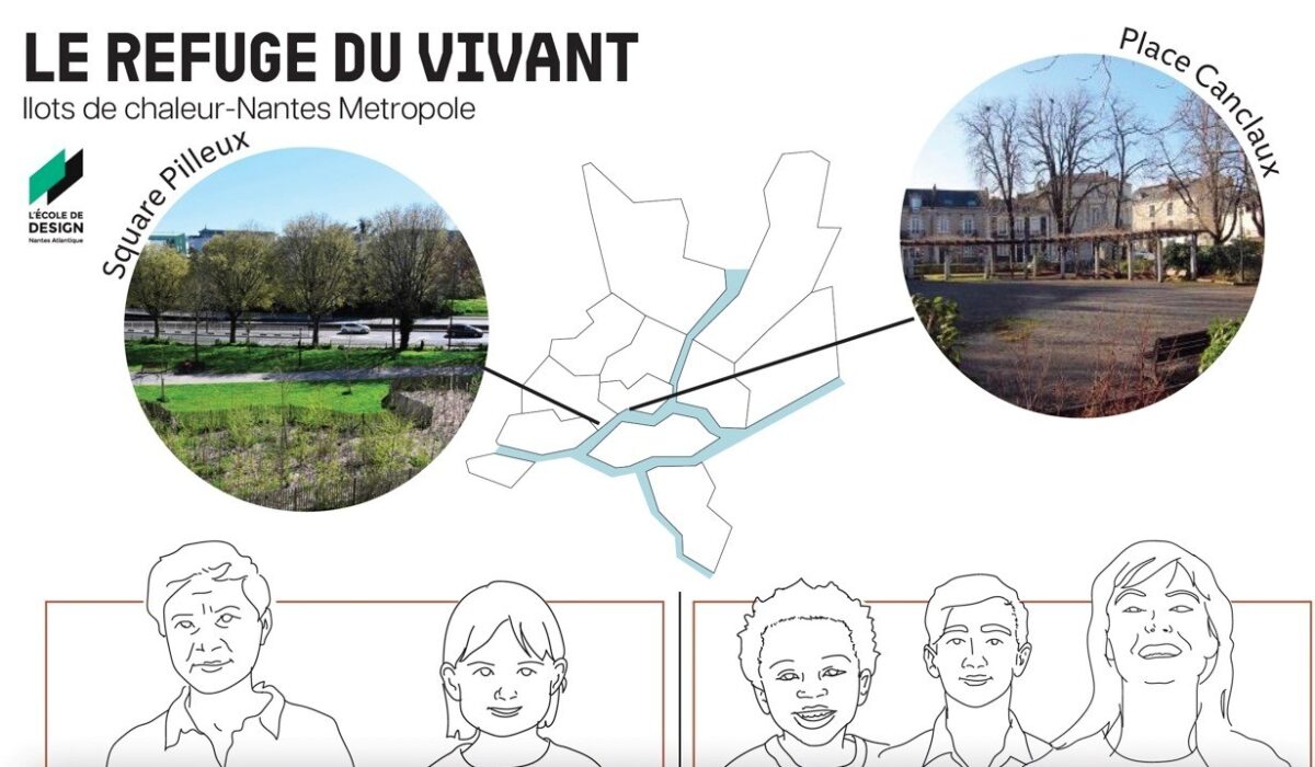 Les designers ont identifié deux espaces urbains nantais : le Square Pilleux et la Place Canclaux, actuellement exposés à ce phénomène d’îlot de chaleur. De plus, les citoyens interrogés sur place évoquent des nuisances sonores et des tensions sociales : dans ces espaces, les bancs sont rares, l’ombre inexistante et les jeux pour enfants abandonnés. Les enfants, personnes âgées, jeunes adultes et parents poursuivent donc leur quête de fraîcheur et de convivialité ailleurs.
