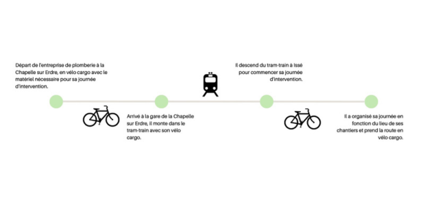 À La Chapelle-sur-Erdre, en Loire-Atlantique, un artisan-plombier pourrait emprunter le tram-train avec son vélo cargo pour commencer sa journée d’intervention à Issé. De même, il pourrait rejoindre tout chantier situé à proximité du tram-train grâce à son vélo-cargo.