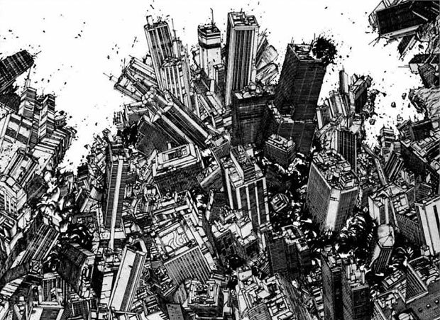 Avec Akira, le dessinateur japonais a signé l’un des grands classiques du manga de science-fiction. L’action se déroule dans un futur proche (2019), dans une ville futuriste baptisée Neo-Tokyo où règne la corruption et la violence, trente ans après une Troisième Guerre mondiale durant laquelle les armes nucléaires ont réduit en poussière la plupart des grandes métropoles mondiales. Neo-Tokyo est une cité tentaculaire d’architecture urbaine, qui semble sans limites géographiques. Et malgré l’étendue de son territoire, elle se révèle une ville grouillante et oppressante, dans la grande tradition des récits cyberpunk des années 1980 comme Ghost in the Shell. La ville d’Akira apparaît ainsi comme le champ d’expérimentations d’un pouvoir scientiste et destructeur, qui s’amuse à élaborer les armes les plus destructrices. « Les immeubles d’Akira qui s’effondrent comme des dominos rappellent le jeu enfantin qui consiste à construire avec minutie un château de sable avant de le piétiner impitoyablement » écrit Nicolas Beudon, conservateur à la BPI, dans le numéro d’avril 2013 de la revue De ligne en ligne.