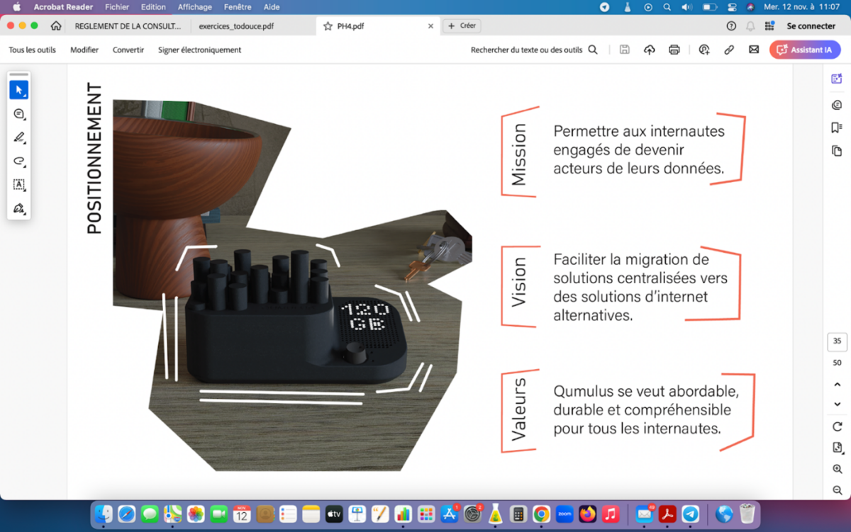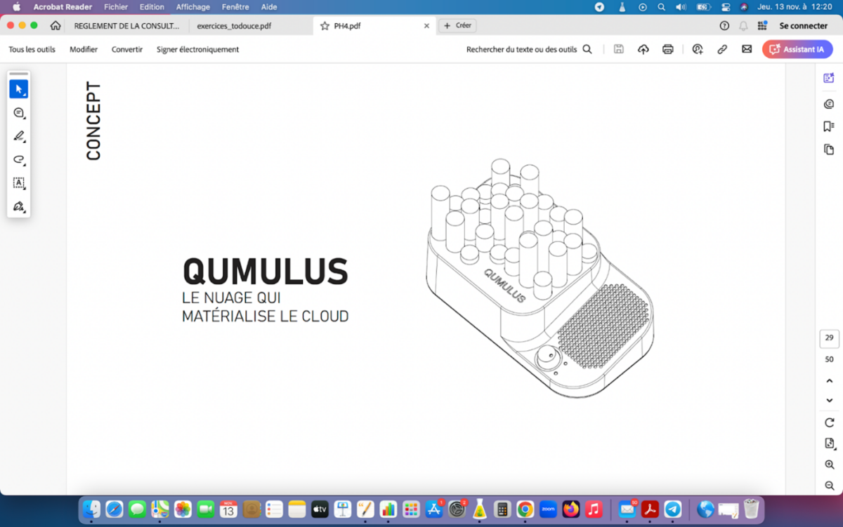 Qumulus incarne un objet design, mais aussi un objet politique, car il questionne la matérialité du numérique, l’empreinte invisible de nos gestes quotidiens et la responsabilité partagée entre l’individu et le système.
